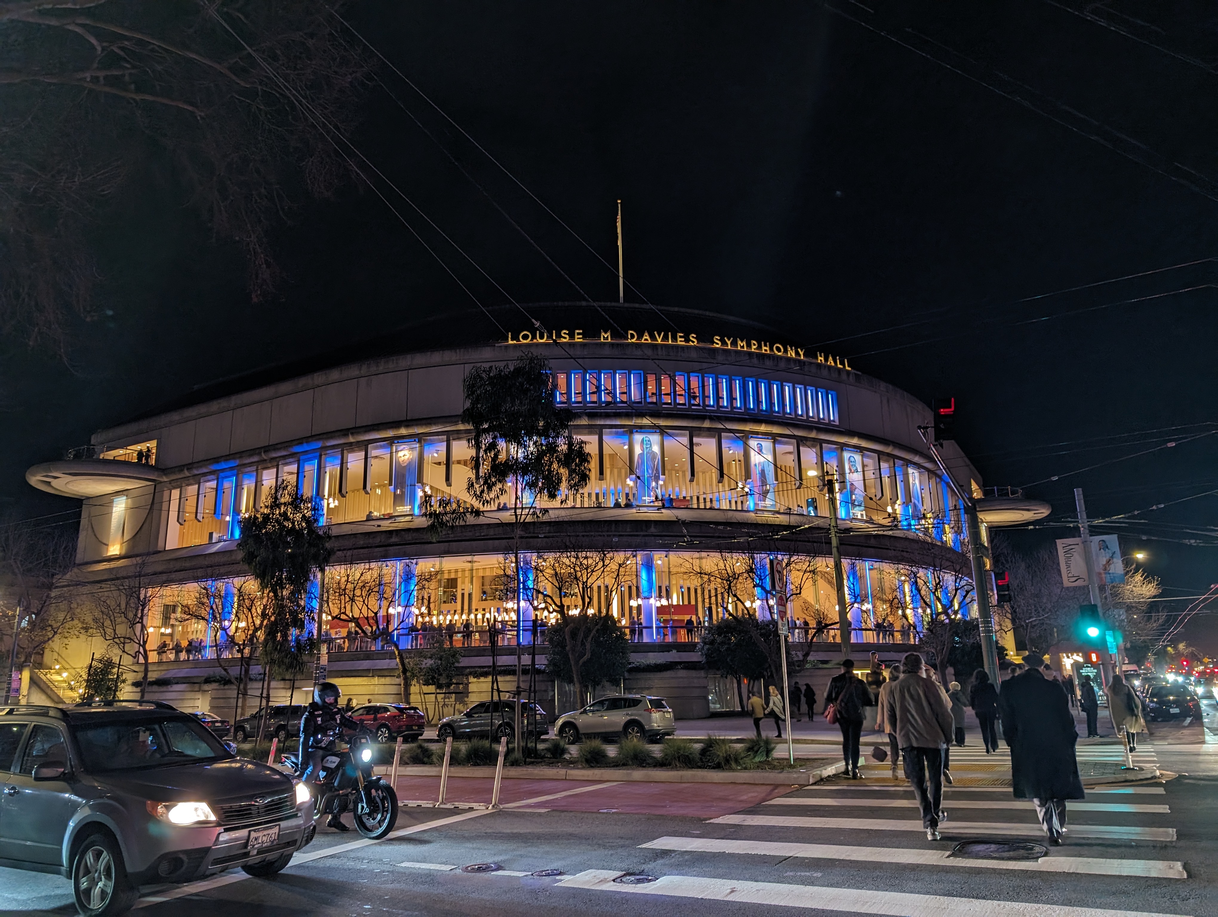 It just did not work. It dulled the orchestral sound considerably; the orchestra didn't come close to filling Davies; the piano, a standard 9-foot Steinway was louder than the orchestra a lot of the time.